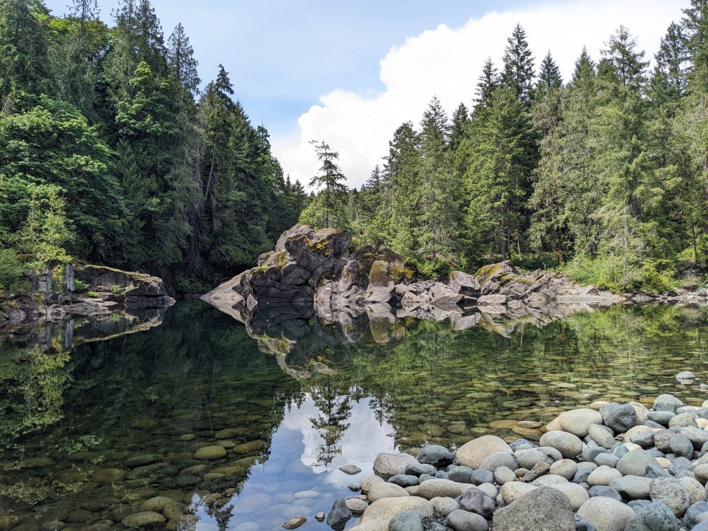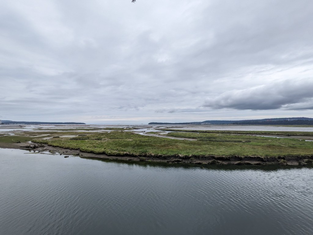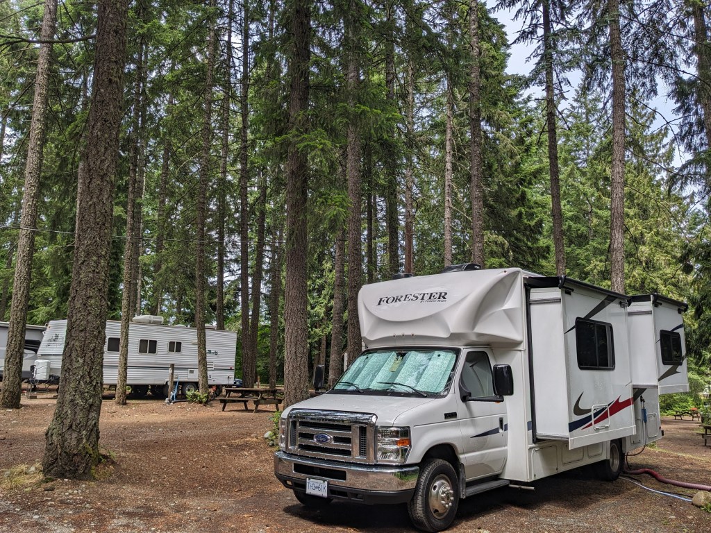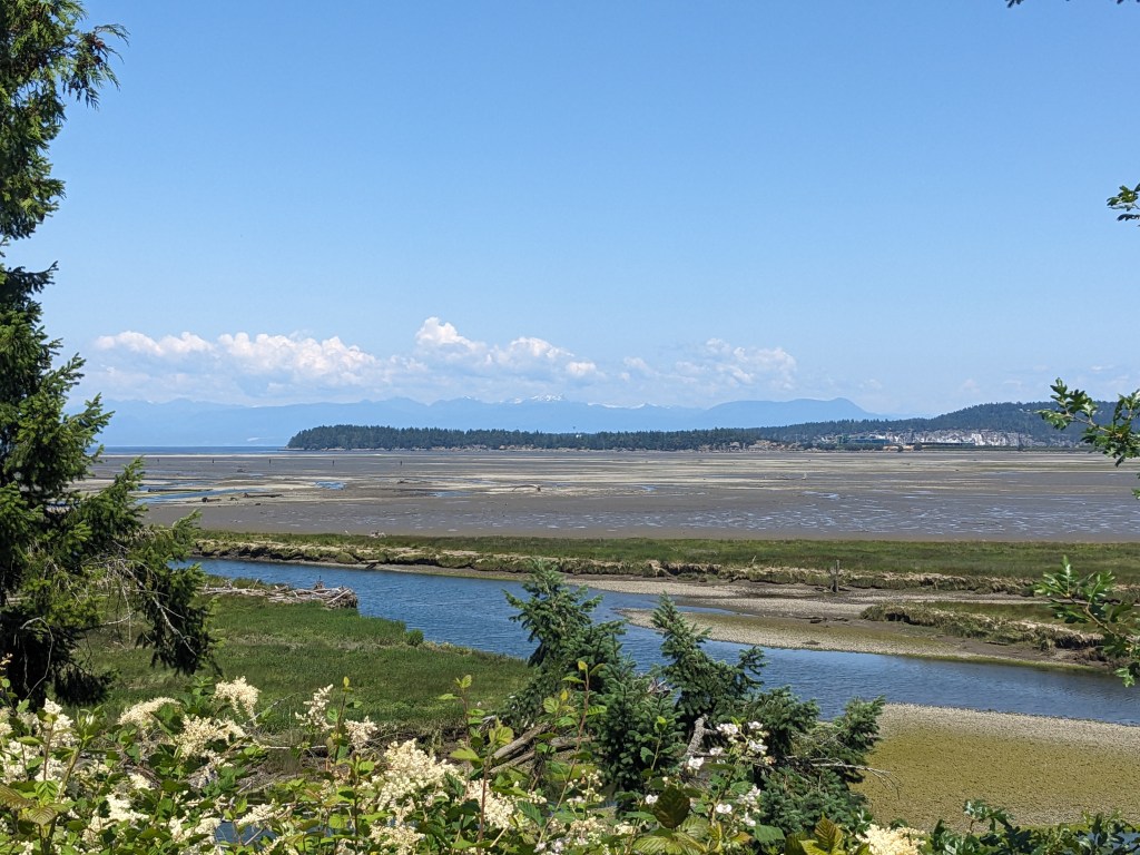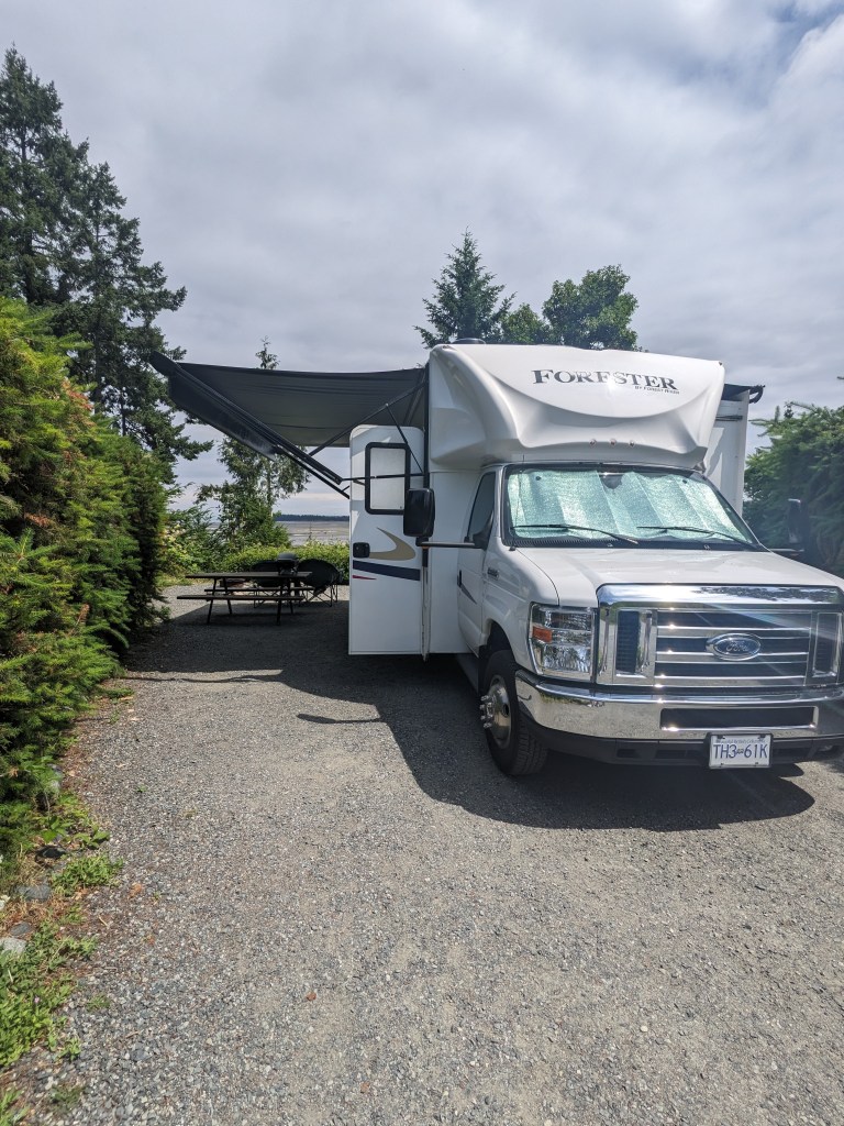 We arrived at the Living Forest Campsite just outside of Nanaimo and were thrilled with our pitch looking out over the tidal mudflats. We still had some unpacking and setting up to do and also laundry, so while Elizabeth did that Warwick booked more RV campsites, put hooks up, set up the new outdoor chairs, table and propane grill. While we ate dinner we watched a seal stunning fish by slapping his tail on the water surface, Bald Eagles soaring above us and bunnies running around our feet….just incredible.