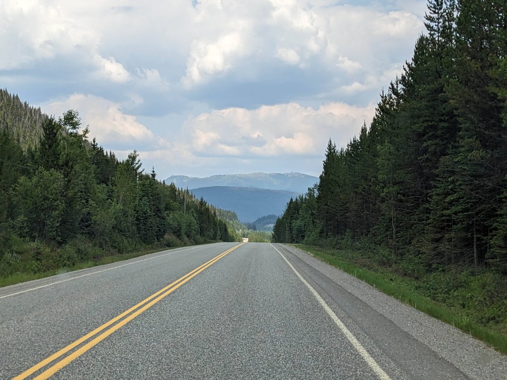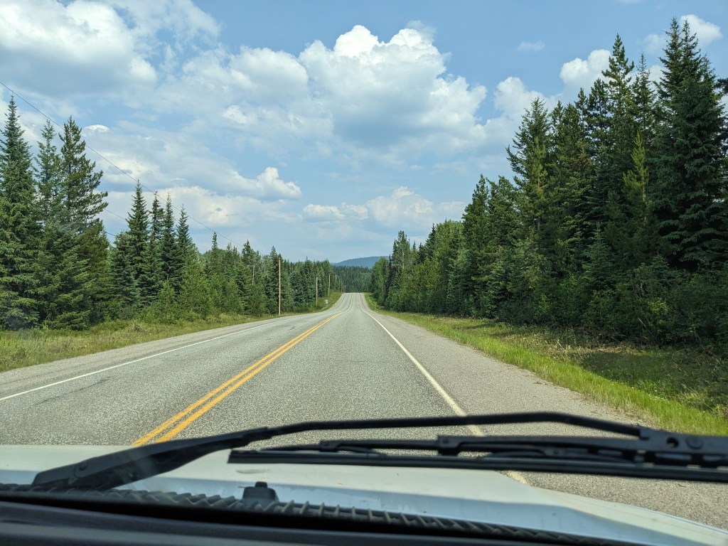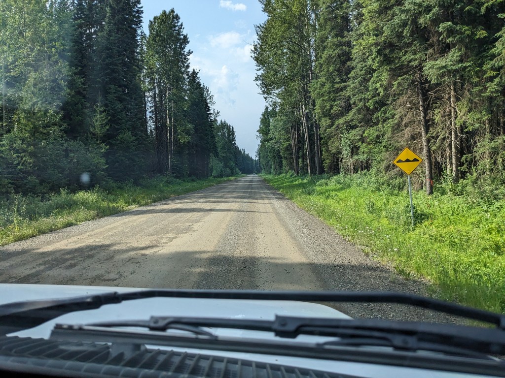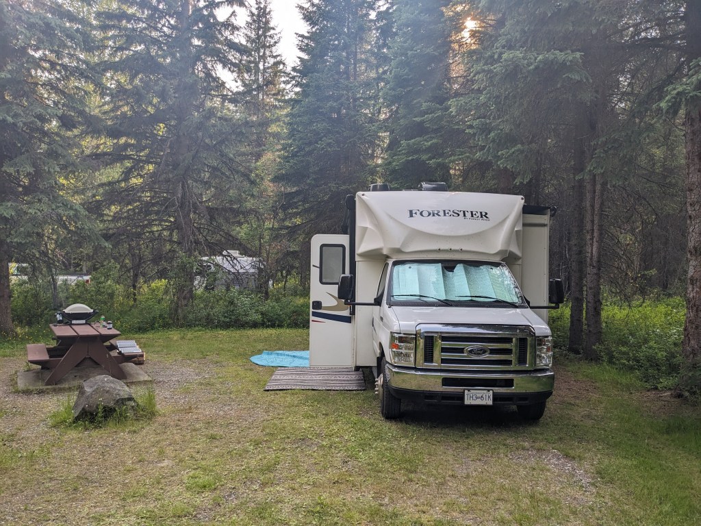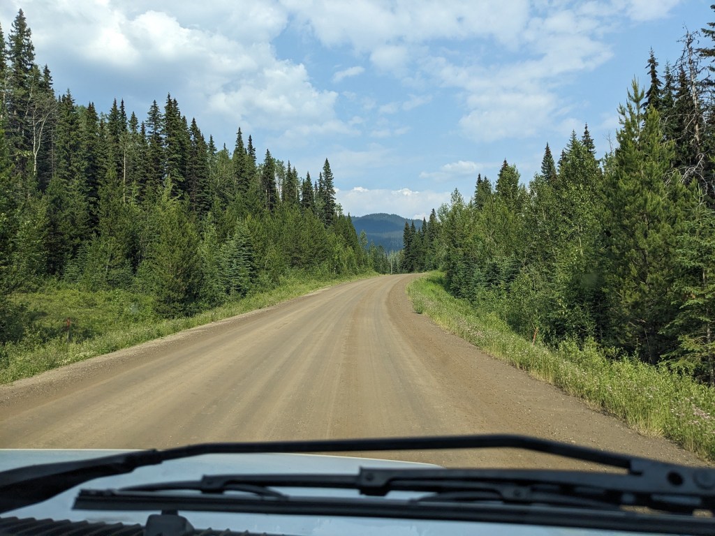 Continuing heading North up highway 97 we passed by the famous Gold Rush towns of 70 Mile House, 100 Mile House and 150 Mile House where the waggons would stop and refresh and the impressive Cariboo Mountains. We branched off onto a smaller route towards Bowron Provincial Park, and after some beautiful lake scenery we turned onto an even smaller route and yet again another smaller and this time unpaved access road….after 25km of unpaved access road we and Delta were shaken to the core. Bowron Lake was an off the beaten track provincial campsite and it was good to be back in nature, well other than ALL the flying, biting insects (note to self buy an insect tent!) But we enjoyed watching the squirrels, gophers and woodpeckers and took a couple of local hikes to view the lake and saw evidence of Bear’s!