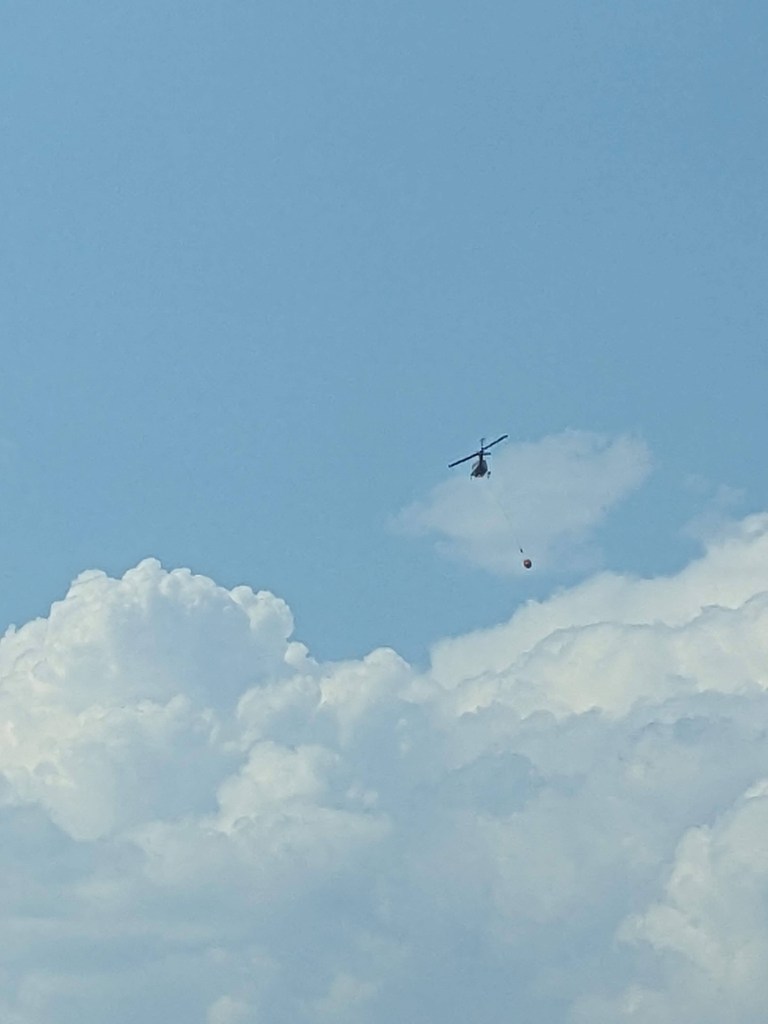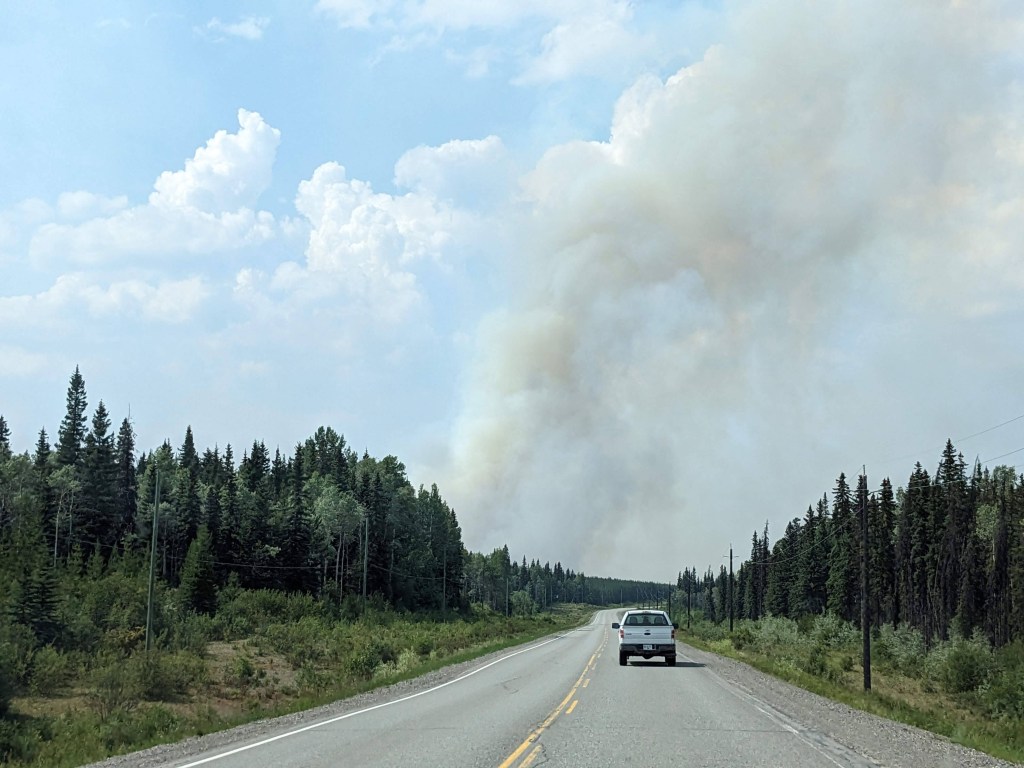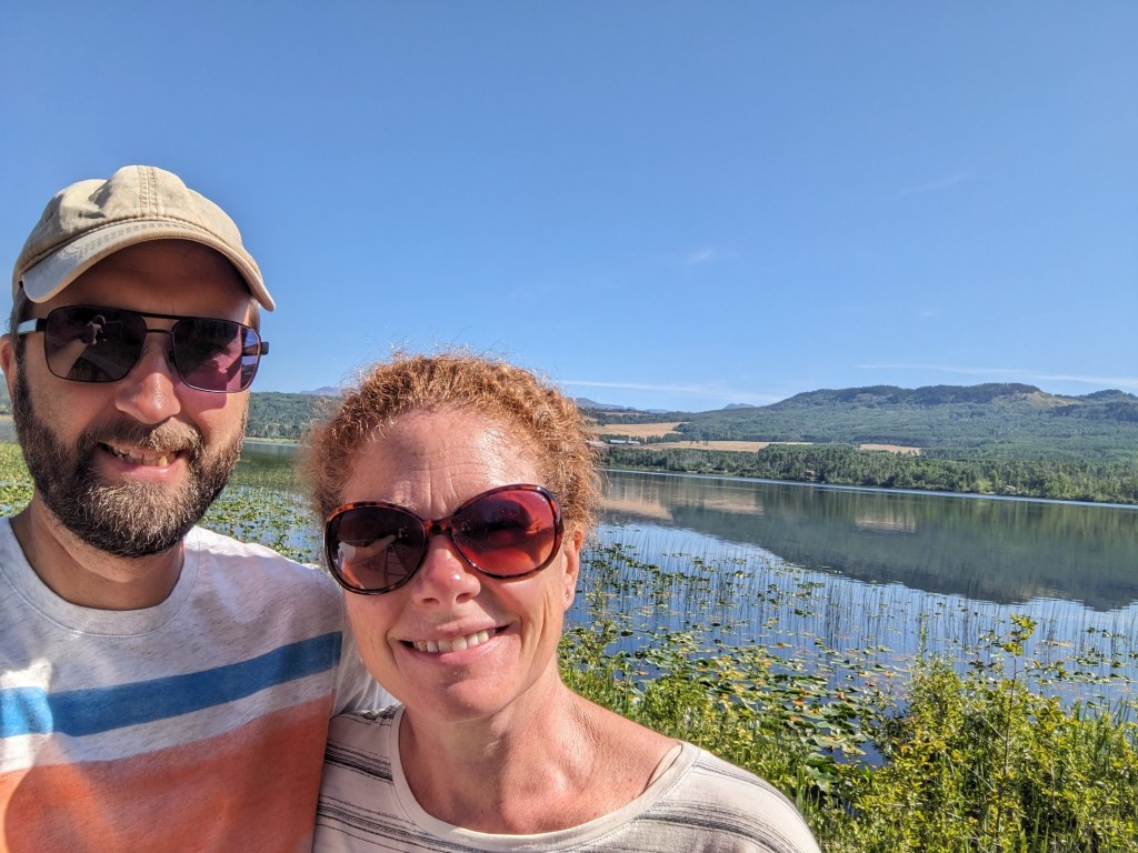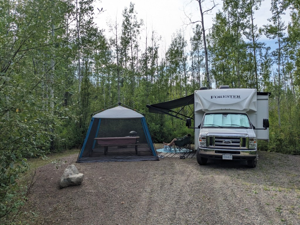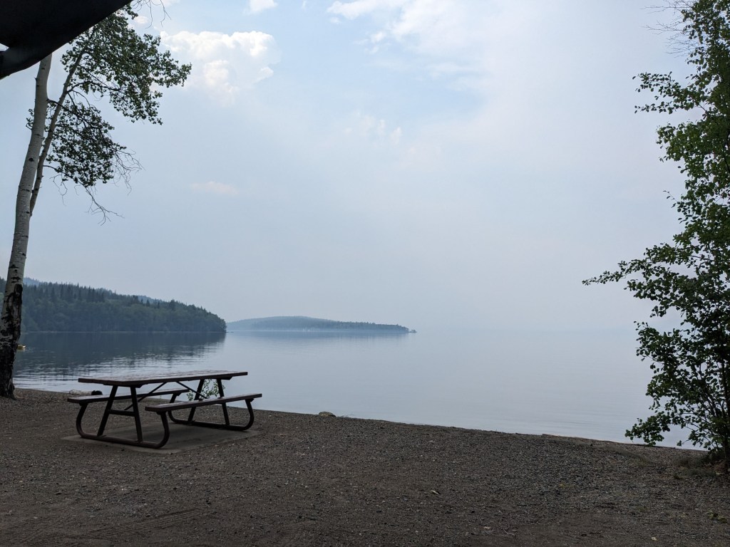We had been aware of the terrible wildfires British Columbia was experiencing this summer and had already had to alter our plans on Vancouver Island when we were unable to visit the West coast due to wildfires closing Highway 4. We had been “watching” the progress of a fire close to Sowchea and we’re not sure if the road would be open, we were keeping our fingers crossed but also being realistic. As we got closer we began to see and smell the smoke from the fire and see the helicopters ferrying water in. The fire was far enough back from the road that the authorities deemed the road safe and it was open and we made it through to Sowchea campsite. When we arrived we had mixed emotions, driving past the wildfire was a little nerve-wracking and we felt sad at the destruction it was causing to people, wildlife and the environment but we were glad to have made it to our campsite. Once parked up we went out to see the view, which was of course blanketed in wildfire smoke…. nevermind there’s always cheese and wine for dinner! After a couple of intense sounding thunderstorms the smoke cleared a little and we were rewarded with a glimpse of the view. In the morning it was even better and the lake was so clear and inviting that Warwick enjoyed a very refreshing swim!