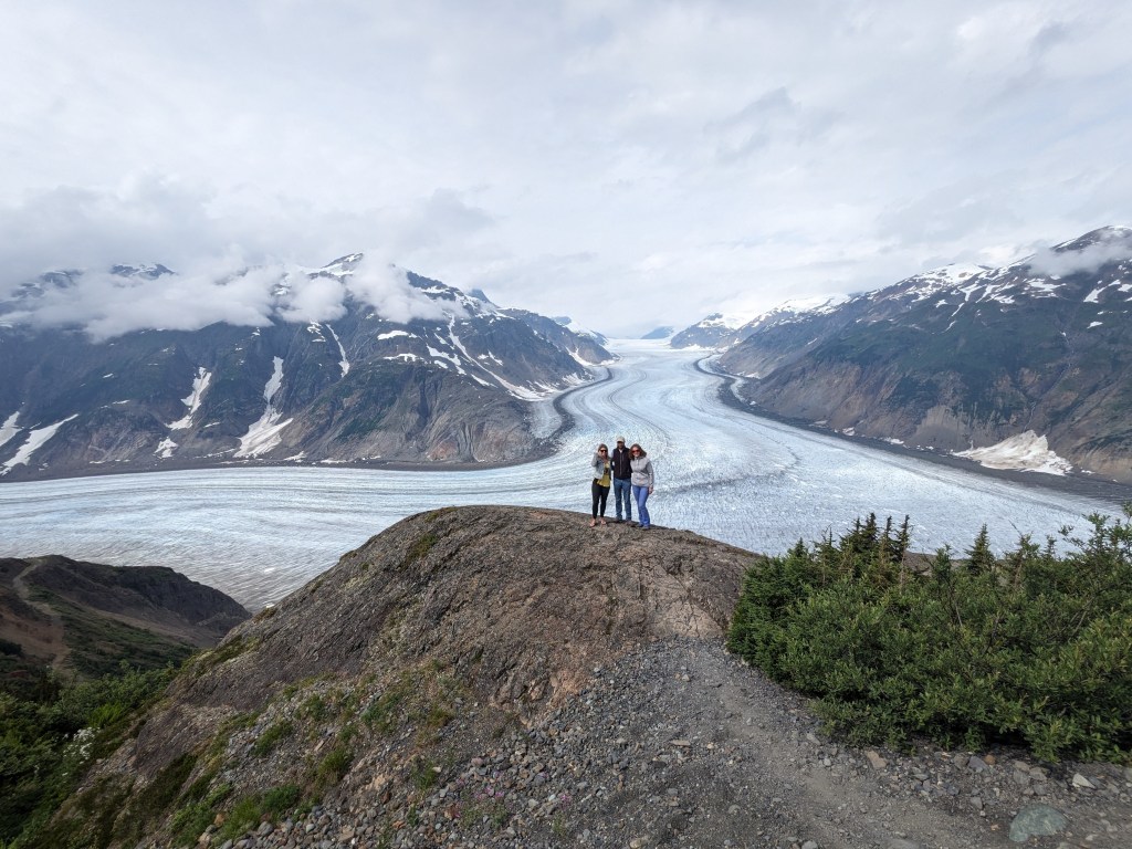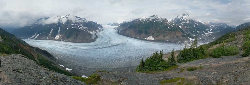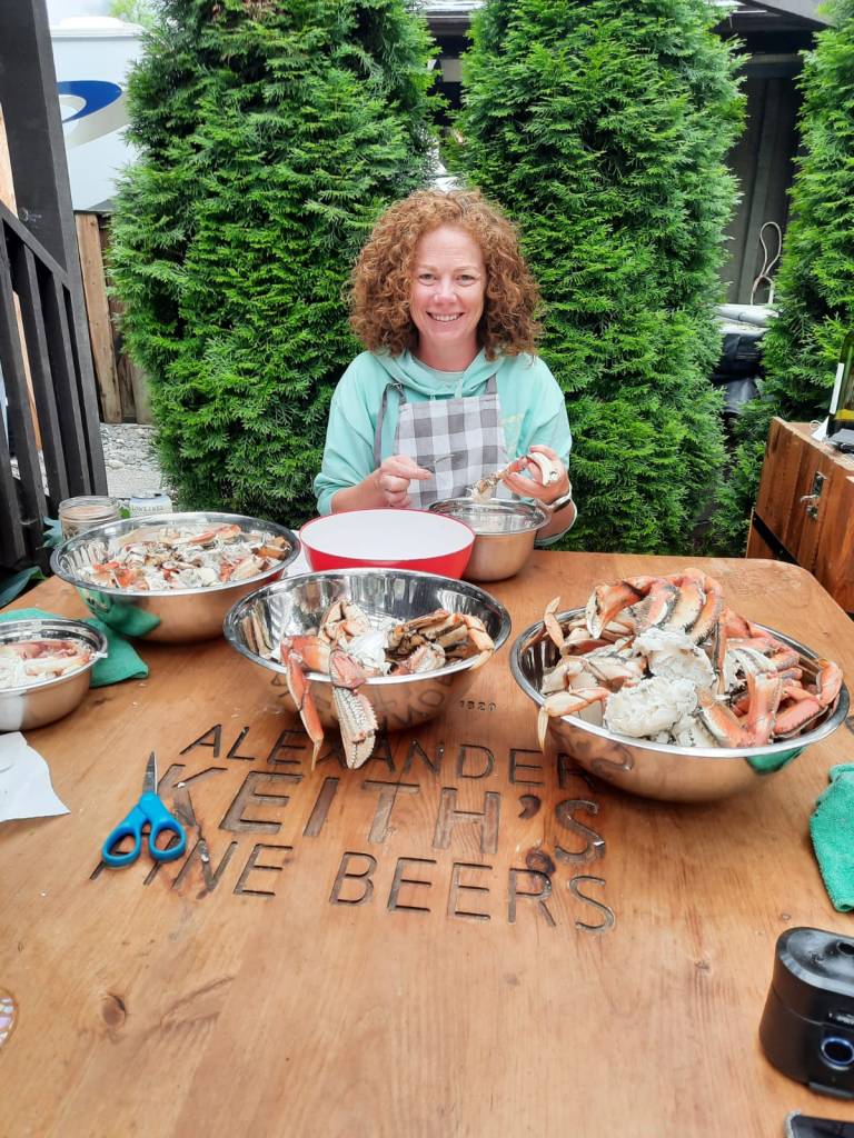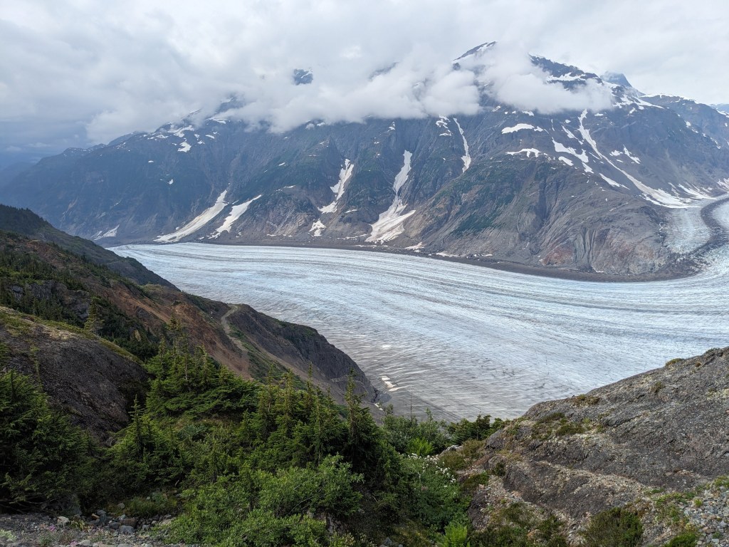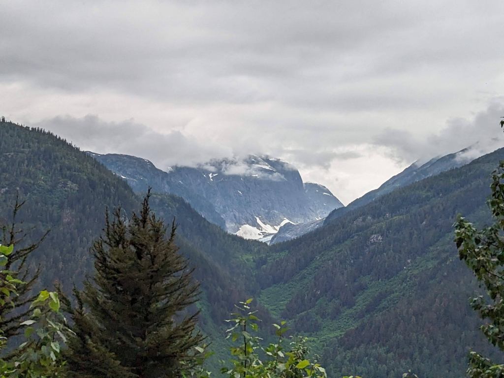 Thursday morning Michelle and Elizabeth set the smoker to work with Alder smoke to smoke the salmon and then Michelle drove us across the US border into Hydra, an interesting looking town and to the bear viewing spot, unfortunately the salmon were not yet running (up the river to spawn) so we didn’t see a bear but it was a beautiful boardwalk. We then carried on up and up and up on a bumpy access road (we were glad Michelle was driving her immense truck and we weren’t in Delta!) through an active mine to Salmon Glacier, which sadly as many others are, is retreating, but is still of an immense scale, it is huge, beautiful and full of so many colours. We spent about 20 minutes appreciating the glacier’s beauty before we could no longer appreciate the mosquitoes attention! We drove back down into Hydra and ate the best Halibut, Shrimp and chips looking out across the Portland Canal from hydra before heading back across the border to pull up the crab pot we’d set the night before. There must have been over 50 crab in the pot! Some were too small to keep and the females all have to be thrown back into the water, we only kept the big males but there were so so many! So once back home Michelle boiled the crab and Elizabeth set to and shucked the crab with the help of Michelle and Mindy and we had the freshest, best tasting crab with garlic butter and a Indian halibut strudel (delicious!) made by Adam for dinner. After dinner Michelle showed Elizabeth how to vacuum pack the smoked salmon and cooked crab and we filled Delta’s freezer full! And Warwick enjoyed some motorcycle time with Adam.
