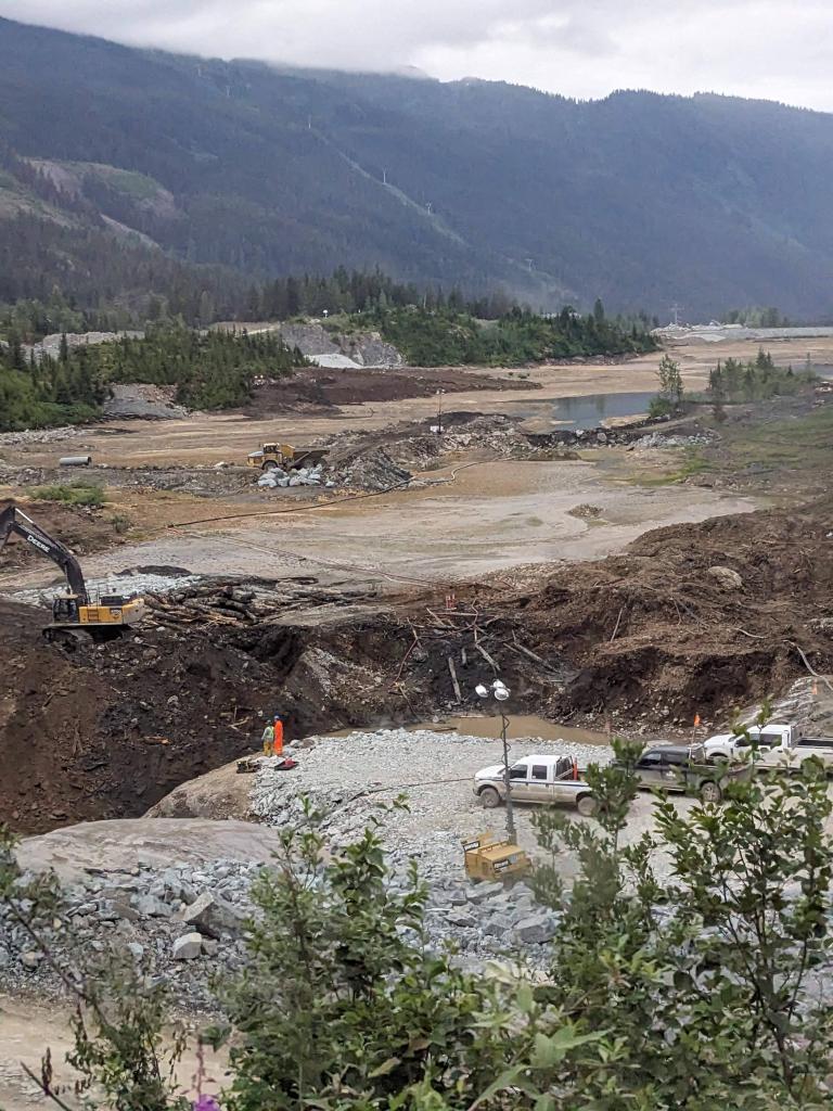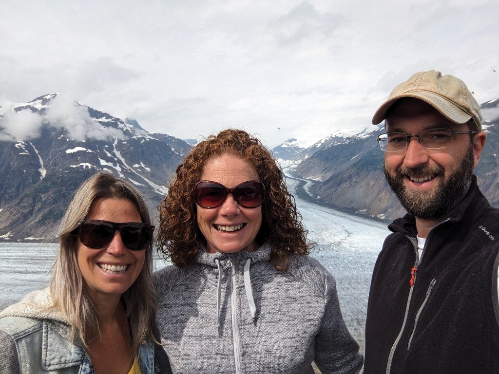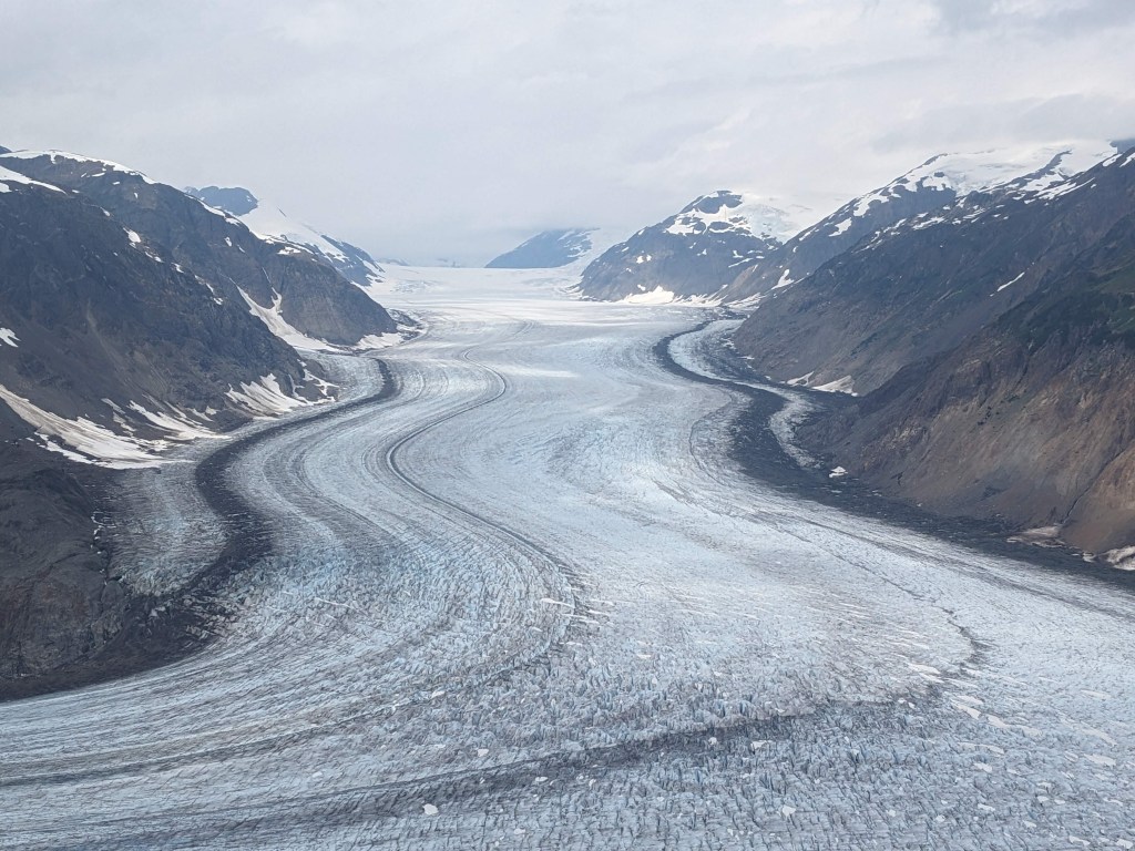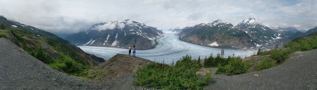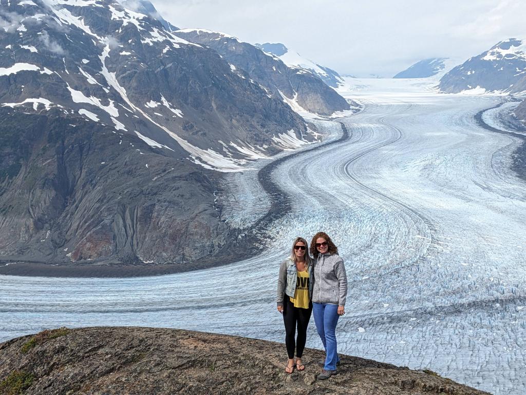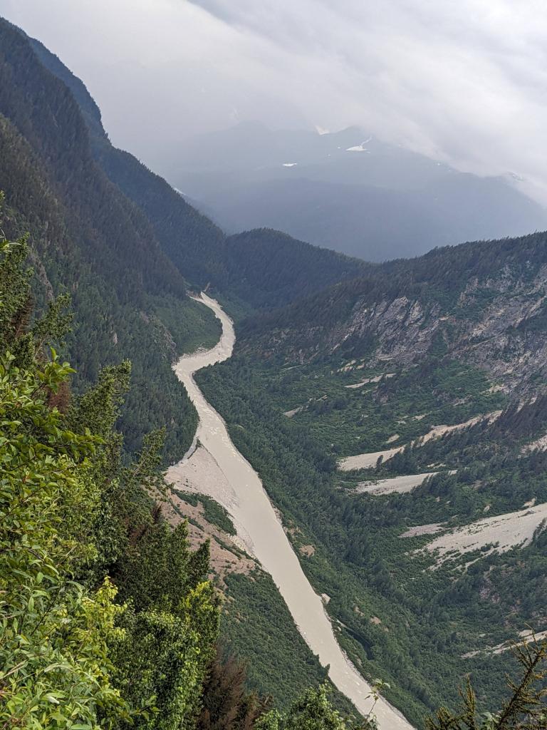Thursday morning Michelle and Elizabeth set the smoker to work with Alder smoke to smoke the salmon and then Michelle drove us across the US border into Hydra, an interesting looking town and to the bear viewing spot, unfortunately the salmon were not yet running (up the river to spawn) so we didn’t see a bear but it was a beautiful boardwalk. We then carried on up and up and up on a bumpy access road (we were glad Michelle was driving her immense truck and we weren’t in Delta!) through an active mine to Salmon Glacier, which sadly as many others are, is retreating, but is still of an immense scale, it is huge, beautiful and full of so many colours. We spent about 20 minutes appreciating the glacier’s beauty before we could no longer appreciate the mosquitoes attention! We drove back down into Hydra and ate the best Halibut, Shrimp and chips looking out across the Portland Canal from hydra before heading back across the border to pull up the crab pot we’d set the night before. There must have been over 50 crab in the pot! Some were too small to keep and the females all have to be thrown back into the water, we only kept the big males but there were so so many! So once back home Michelle boiled the crab and Elizabeth set to and shucked the crab with the help of Michelle and Mindy and we had the freshest, best tasting crab with garlic butter and a Indian halibut strudel (delicious!) made by Adam for dinner. After dinner Michelle showed Elizabeth how to vacuum pack the smoked salmon and cooked crab and we filled Delta’s freezer full! And Warwick enjoyed some motorcycle time with Adam.