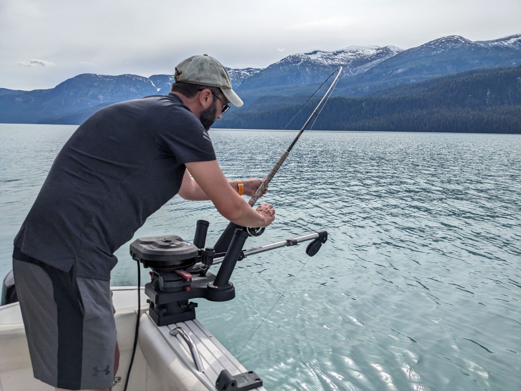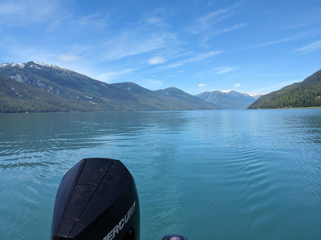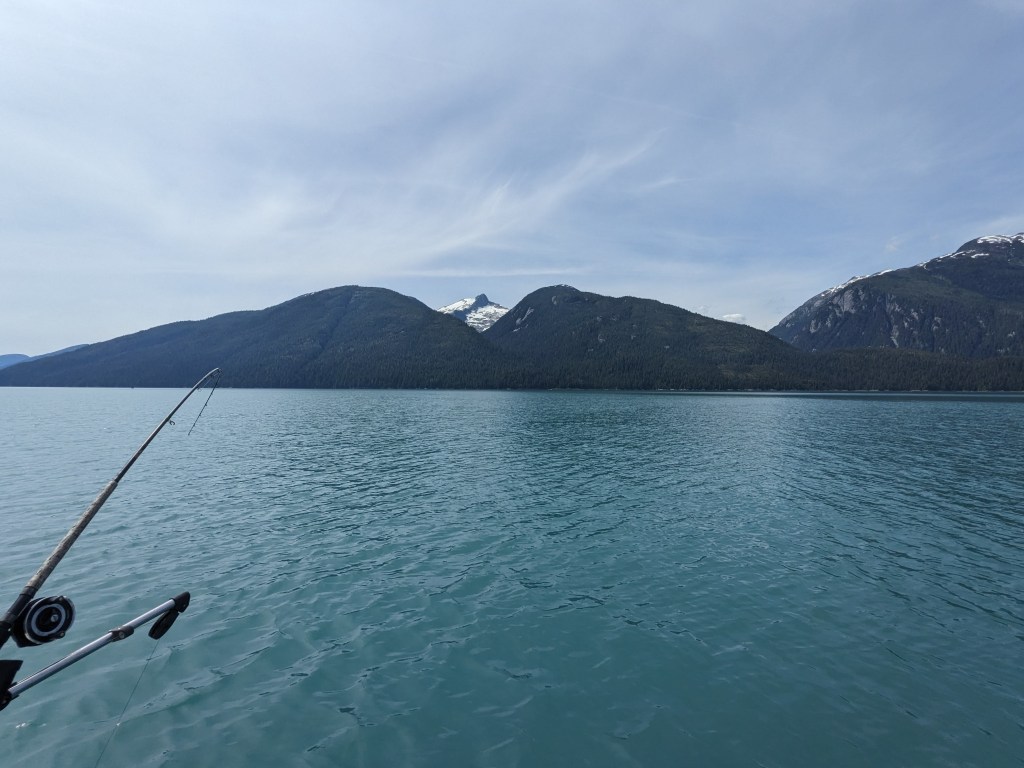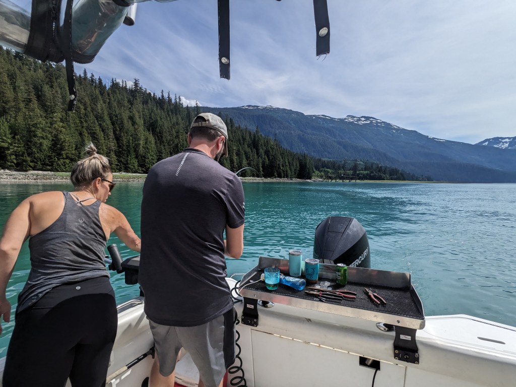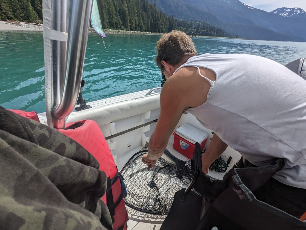 Wednesday was slow, very slow for Elizabeth! But in the afternoon the four of us went down to Adam and Michelle’s boat and set a crab pot, which later that evening had enticed several large crabs into it. Dinner that night was fresh crab, lobster and steak….divine! Thursday was a day spent out on the boat fishing; now we have never fished in our lives and we’re a little apprehensive (especially Elizabeth with seasickness loming) but we can honestly say it was the best day of our adventure so far. We raced out of the harbour down the narrow inlet with towering mountains, Canada on one side of us and America on the other, watching the glacial pale blueish grey fresh water turn to a dark blue saline sea. To say the scenery was spectacular is an understatement, we had never seen anything so beautiful. After about an hour we had reached our fishing grounds and we spent the whole day gently pootleing around catching salmon! Warwick really took to fishing and caught a decent sized pink salmon! That evening after resetting the crab pot and Adam and warwick had cleaned the fish, Elizabeth and Michelle prepped the salmon for smoking the next day by salting and sugar soaking it and then setting it dry in front of a fan.