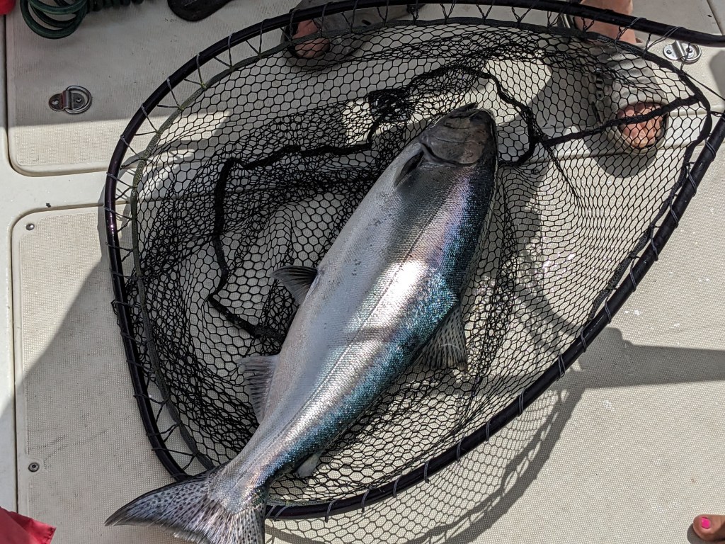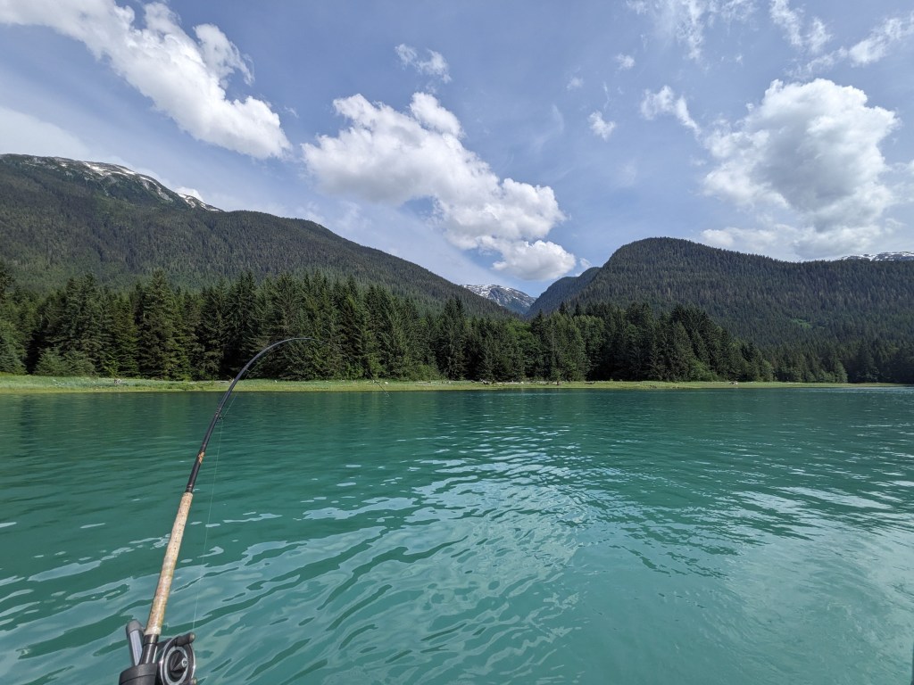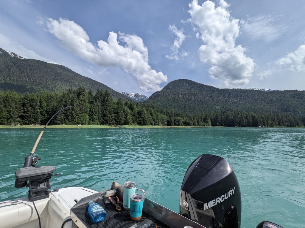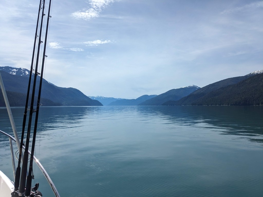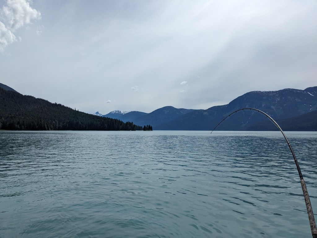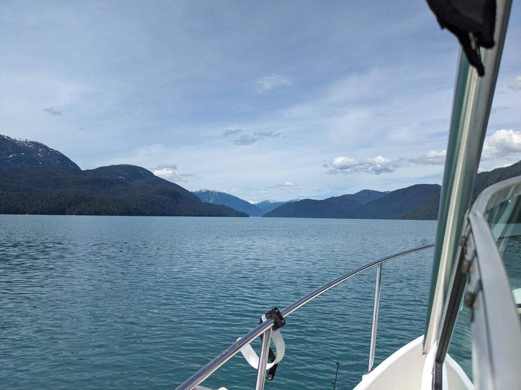 Wednesday was slow, very slow for Elizabeth! But in the afternoon the four of us went down to Adam and Michelle’s boat and set a crab pot, which later that evening had enticed several large crabs into it. Dinner that night was fresh crab, lobster and steak….divine! Thursday was a day spent out on the boat fishing; now we have never fished in our lives and we’re a little apprehensive (especially Elizabeth with seasickness loming) but we can honestly say it was the best day of our adventure so far. We raced out of the harbour down the narrow inlet with towering mountains, Canada on one side of us and America on the other, watching the glacial pale blueish grey fresh water turn to a dark blue saline sea. To say the scenery was spectacular is an understatement, we had never seen anything so beautiful. After about an hour we had reached our fishing grounds and we spent the whole day gently pootleing around catching salmon! Warwick really took to fishing and caught a decent sized pink salmon! That evening after resetting the crab pot and Adam and warwick had cleaned the fish, Elizabeth and Michelle prepped the salmon for smoking the next day by salting and sugar soaking it and then setting it dry in front of a fan.