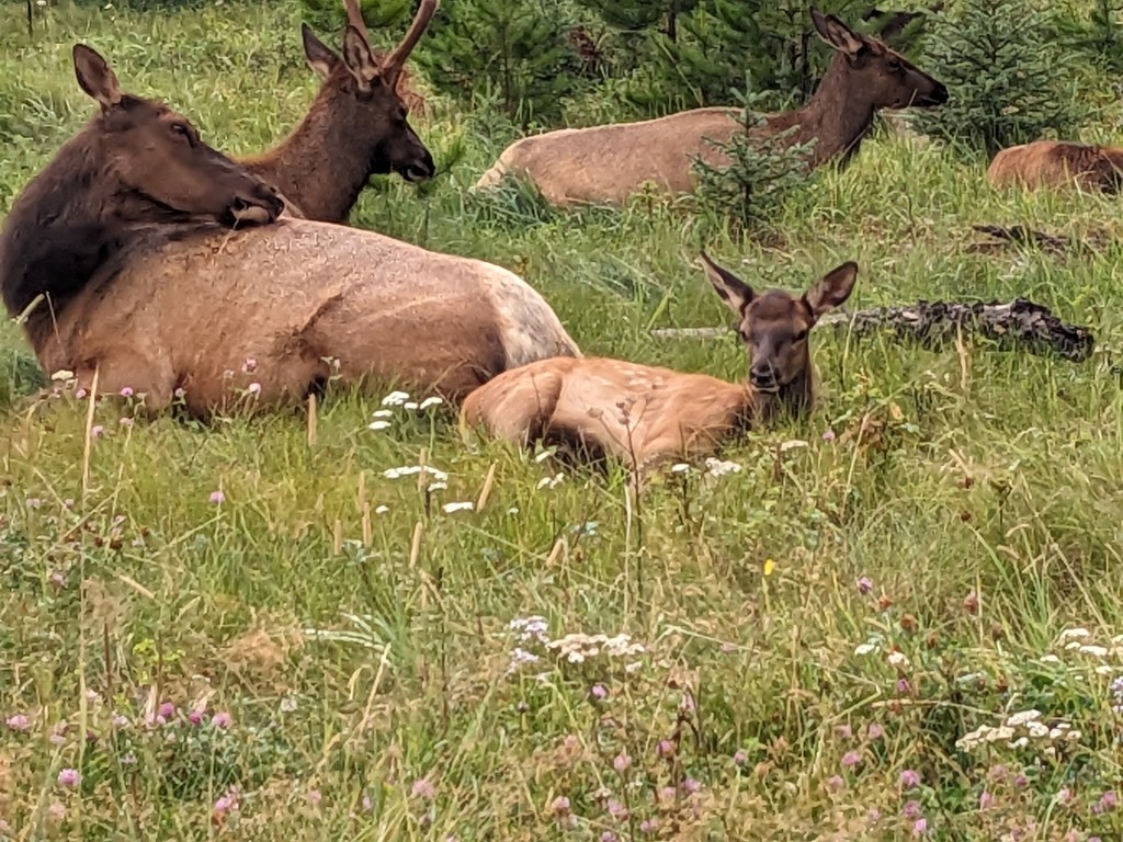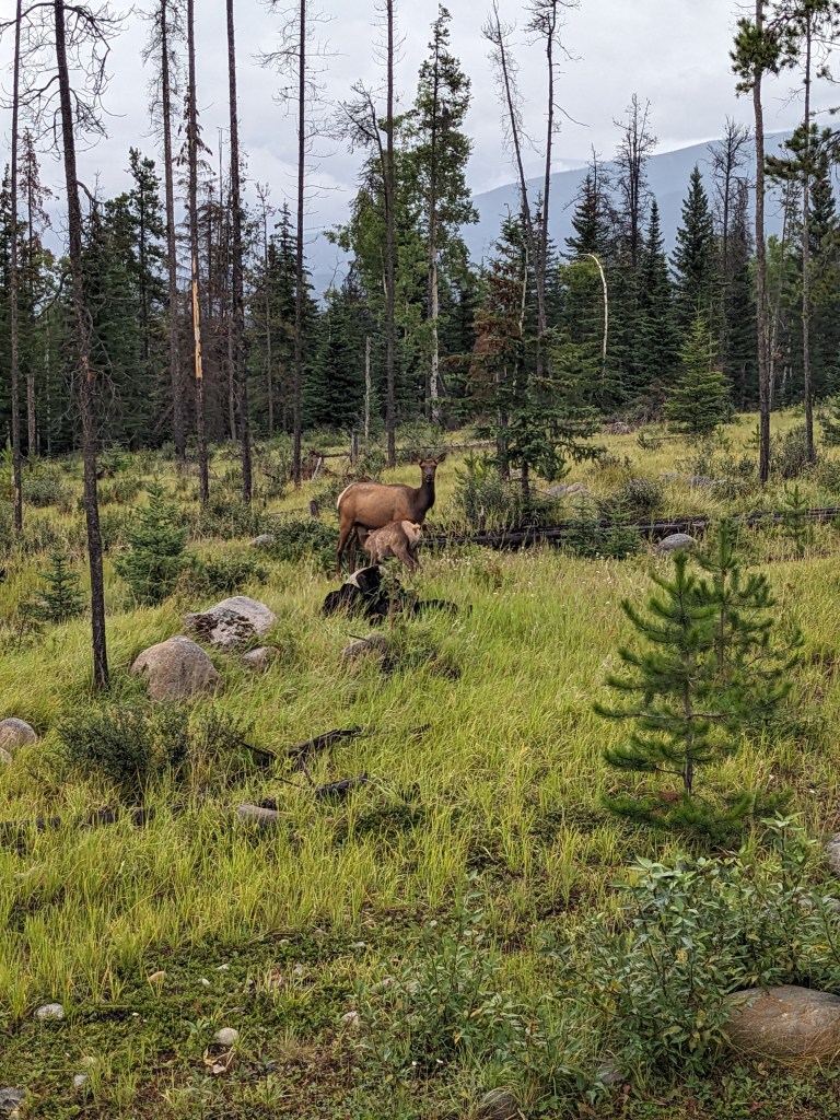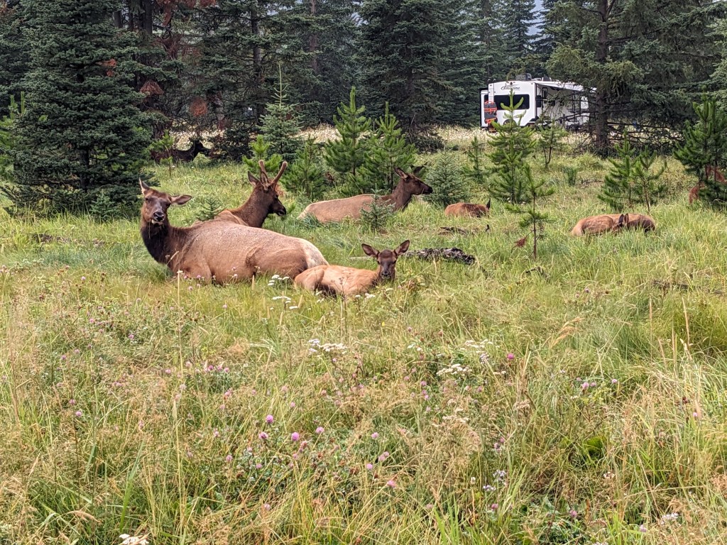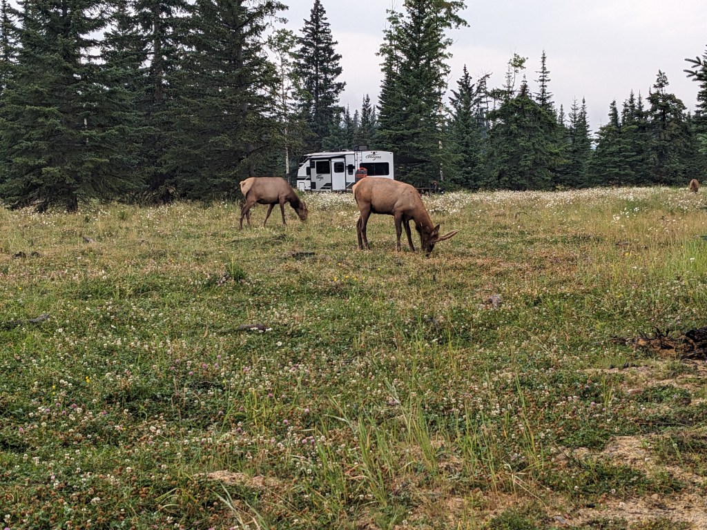 After driving down the Alaska Highway we were looking forward to a few nights in Jasper National Park and it didn’t disappoint! We crossed the provincial border from British Columbia into Alberta and jumped a time zone. The weather was iffy but our pitch at Whistler’s campground was perfect; we had fabulous views, fantastic neighbours (Anita & Mark, and Axel the totally gorgeous Rottweiler!) and there were a lot of hikes to do! Again sometimes we lost the views due to smoke and/or bad weather but we loved our time exploring Jasper town and the surroundings; Maligne Canyon and the Fort trail being our favourites. But the true highlight of our stay in Jasper were the Elk that grazed and slept all throughout our campsite! We kept a safe distance as they are wild animals but it was just amazing to see them wandering around so close to motorhomes and tents.