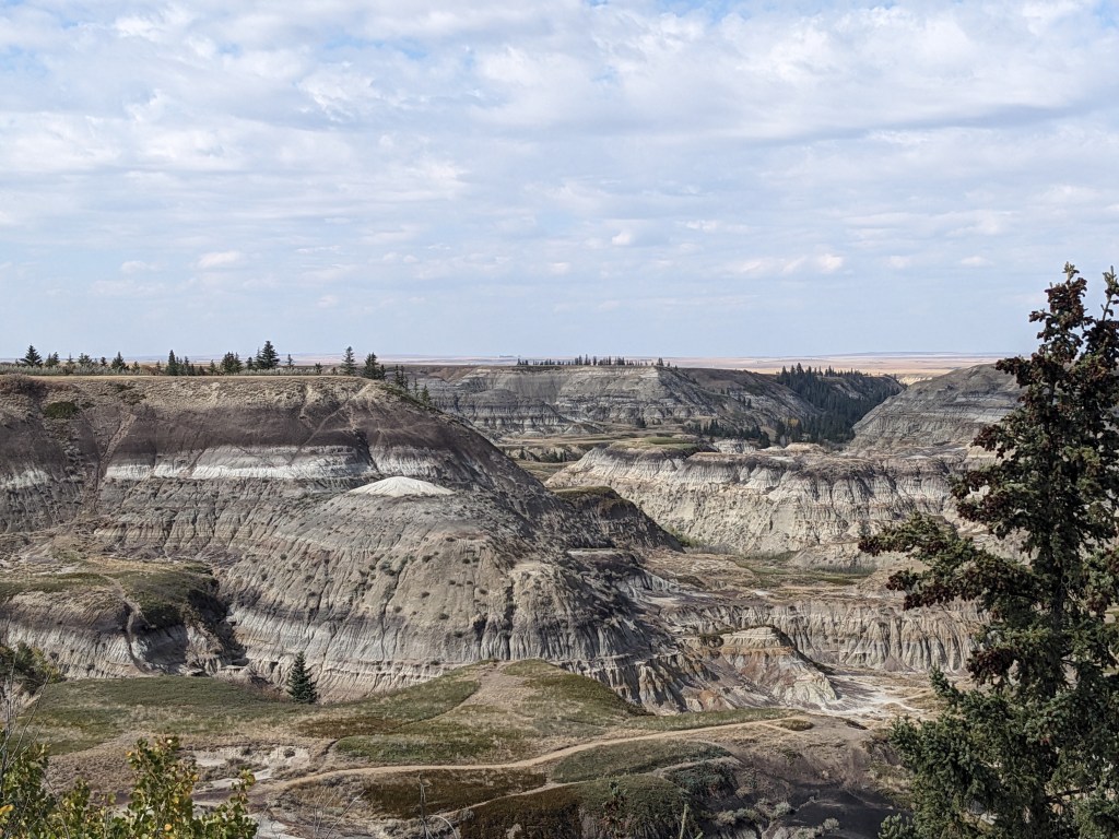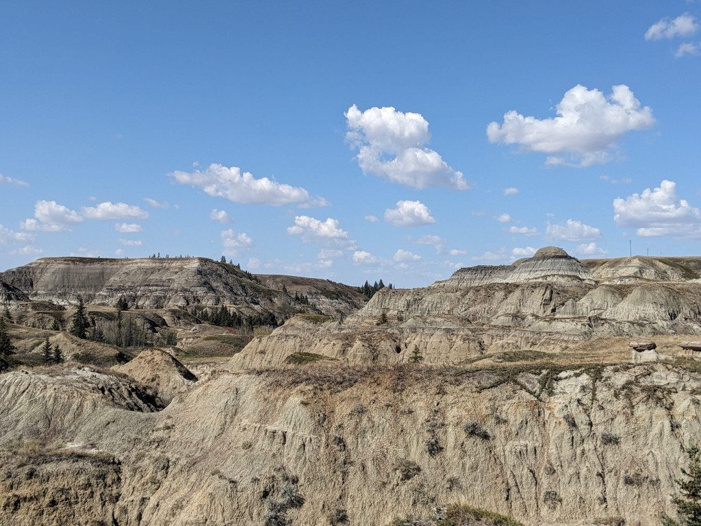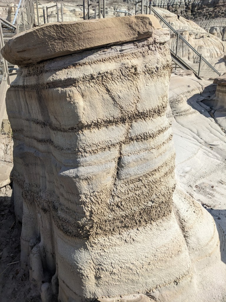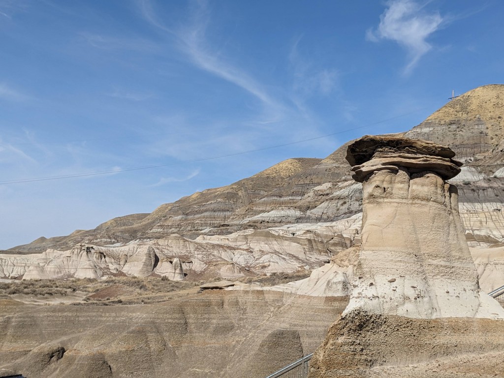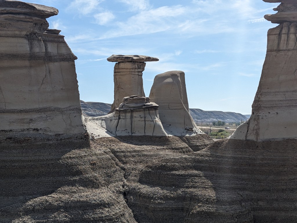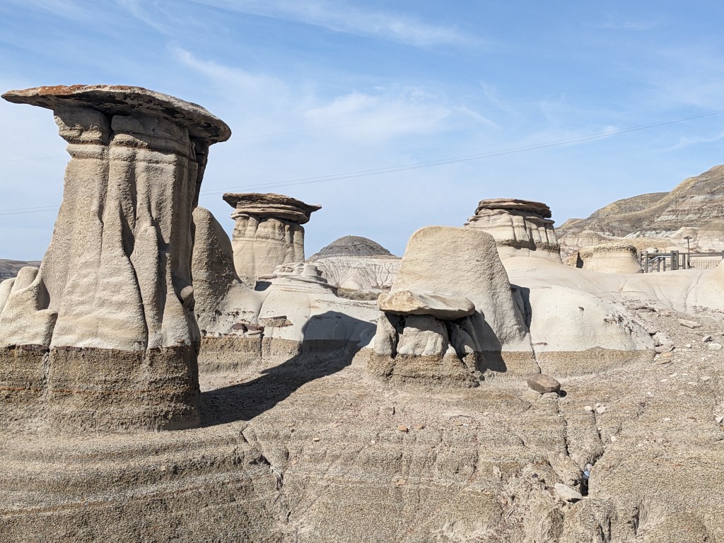 As we left Drumheller, to continue our journey East, we made a stop to visit the impressive Drumheller Hoodoos (a hoodoo is a tall, thin spire of rock formed by erosion), the hoodoos in Drumheller consist of relatively soft rock (claystone and sandstone) and are topped by harder, less easily eroded stone (limestone) that has protected each column from the elements. These hoodoos have a unique mushroom-like appearance as the underlying base erodes at a faster rate compared to the capstones….they are truly fascinating structures!